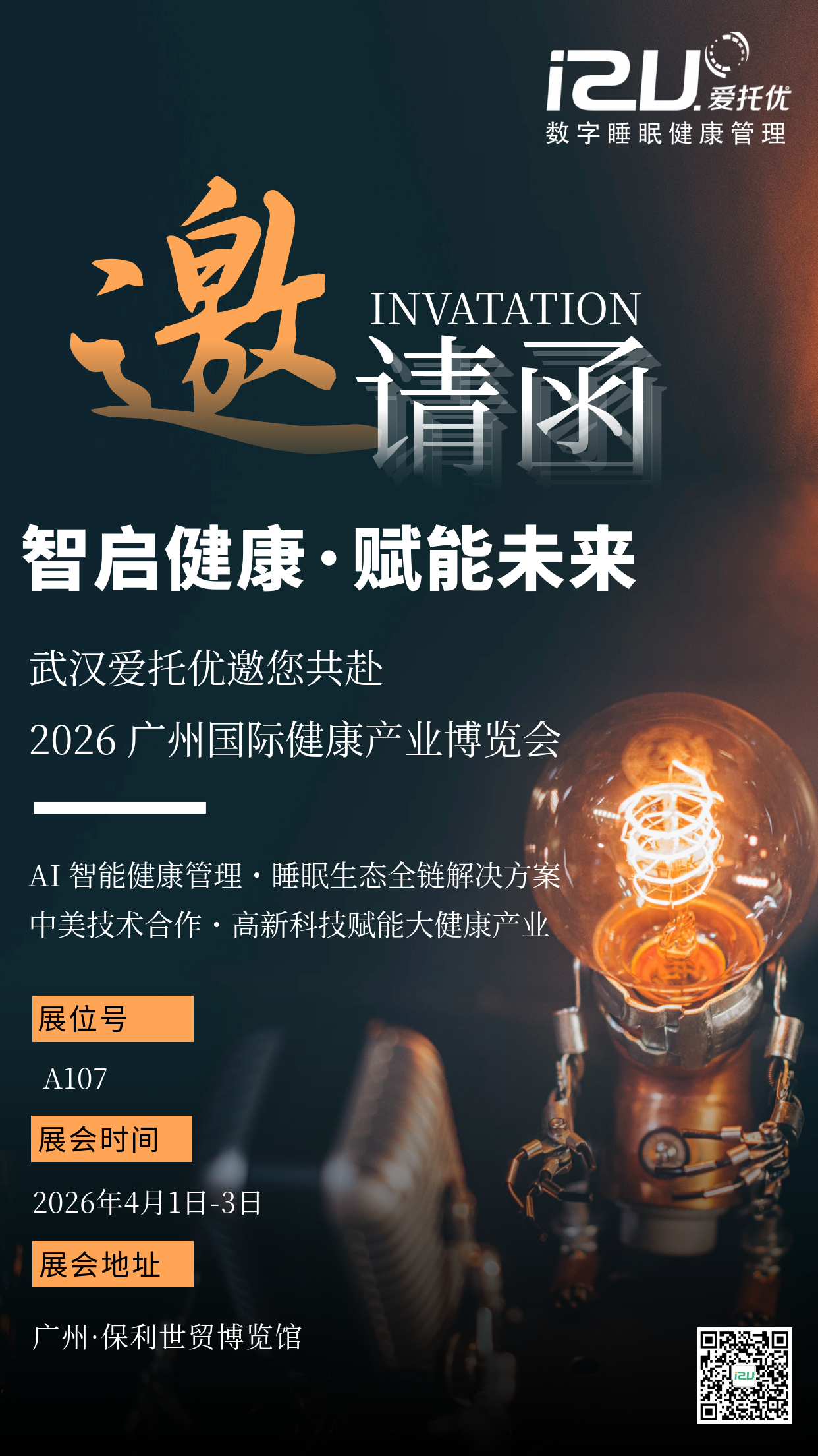 大健康产业风口正盛,智能科技成为驱动行业升级的核心动力。2026广州国际健康产业博览会如约而至,武汉爱托优健康管理有限公司携旗下全系列智能健康管理核心产品,强势登陆展会现场,展位A107恭候各位莅临体验,近距离感受科技与健康的深度融合。